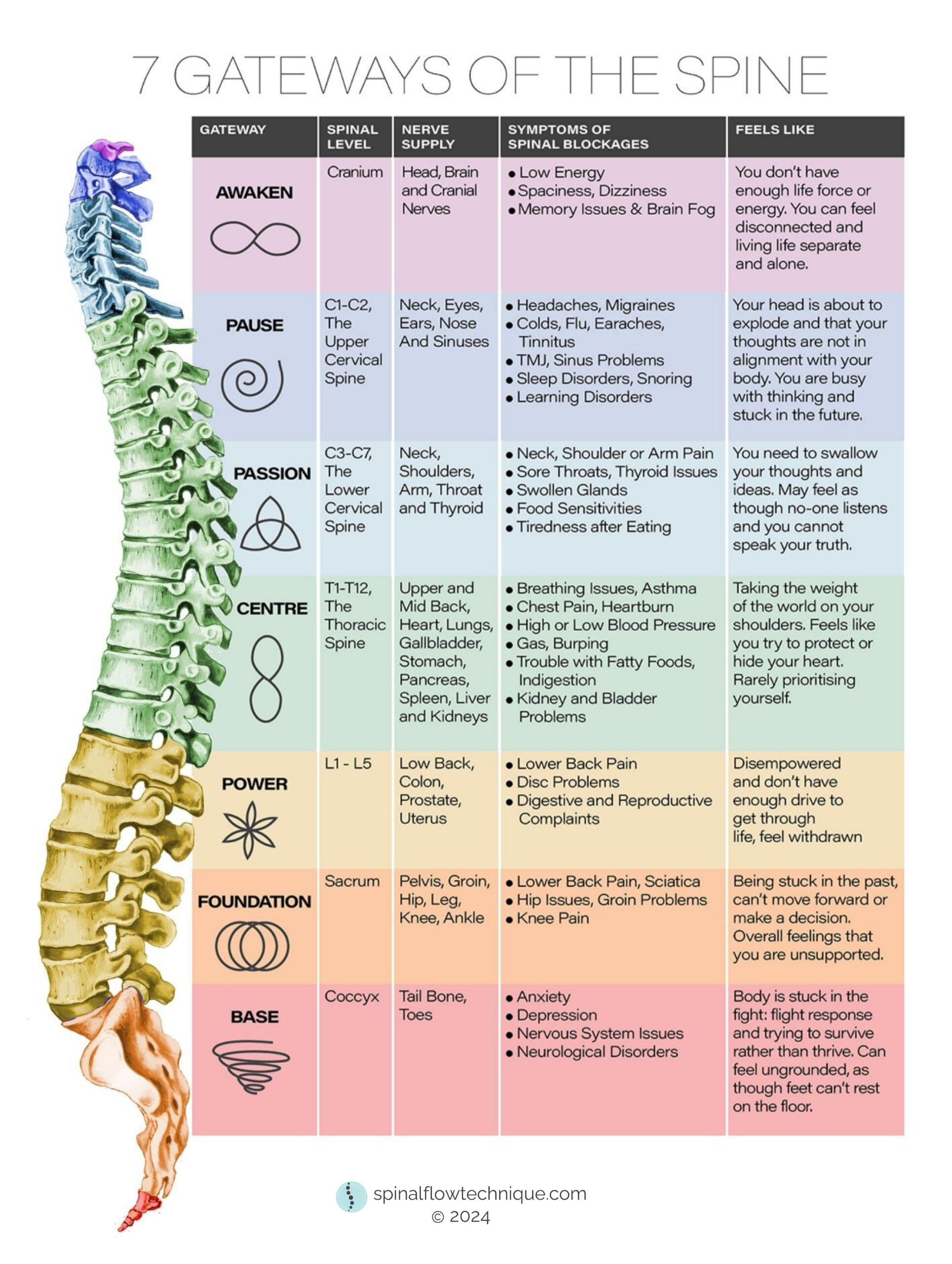 The Spinal Flow® Technique is a philosophy, a science, and an intuitive, hands-on approach that prompts our spine and nervous system to release stress and help heal itself.There is an innate intelligence inside every human body to grow, repair and heal itself. Just as our gut digests our food, our hair grows and our heart beats naturally, our bodies know how to harness this innate intelligence – or Life Energy – to heal and grow.The spine and nervous system is the pathway through which our Life Energy flows. Unreleased stress creates blockages in the spine which prevents the flow of this energy.By releasing stress stored in the spine, Spinal Flow helps restore the flow of healing Life Force Energy through every vertebrae in the spine and to every cell in the body.Below is a chart of the 7 Gateways of the Spine and how each part of our spine correlates with various parts of our body.